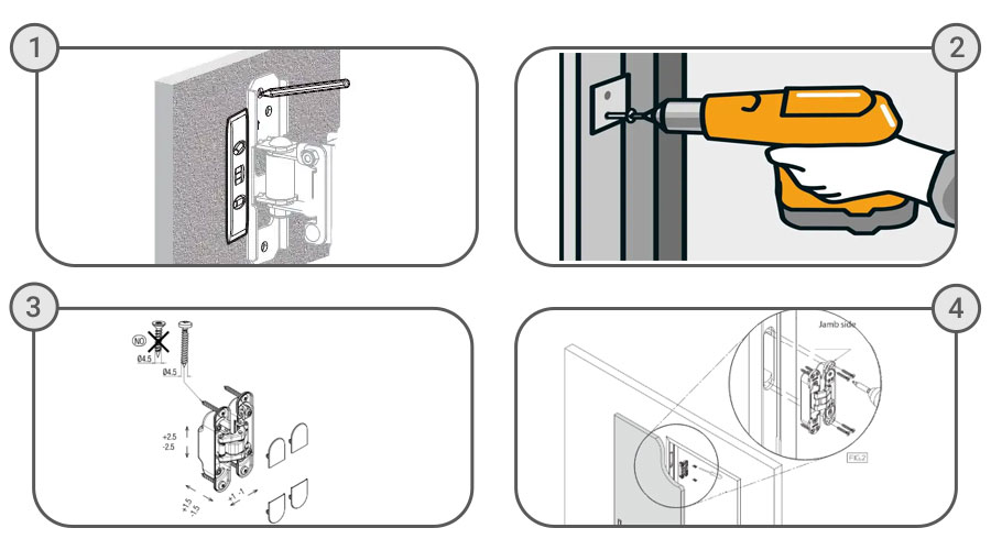4- درب را باز و بسته کنید و مطمئن شوید که بهدرستی تراز شده و بهطور روان حرکت میکند. در صورت نیاز، میتوانید لولاها را در سه جهت افقی (X) و عمق (Y) تا ±1 میلیمتر و عمودی (Z) تا ±3 میلیمتر تنظیم کنید تا به نتیجه دلخواه در نصب و عملکرد درب برسید.